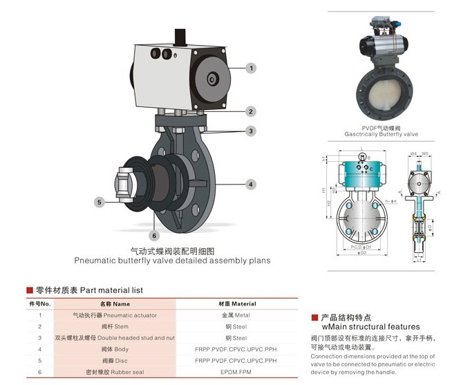 氣動(dòng)塑料蝶閥(RPP.CPVC.UPVC.PVDF,PTFE)氣動(dòng)蝶閥等詳細(xì)資料:氣動(dòng)塑料蝶閥重量輕、耐腐蝕性好,氣動(dòng)塑料蝶閥被應(yīng)用于多個(gè)領(lǐng)域,如一般純水和生活飲水的管路系統(tǒng)、排水和污水管路系統(tǒng)、鹽水和海水管路系統(tǒng)、酸堿和化學(xué)溶液系統(tǒng)等多個(gè)行業(yè),氣氣動(dòng)塑料蝶閥外型結(jié)構(gòu)緊湊美觀,本體重量輕容易安裝 耐腐蝕,應(yīng)用范圍廣,材質(zhì)衛(wèi)生無毒 耐磨損、容易拆卸,維護(hù)簡單。