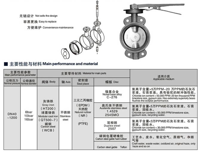 氣動(dòng)脫硫蝶閥為適應(yīng)石灰石漿液和石膏漿液的腐蝕,閥板和閥桿采用了