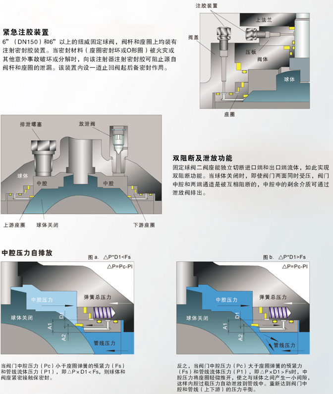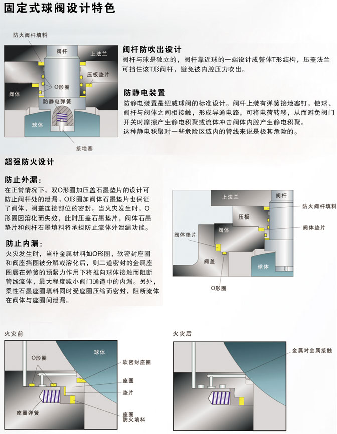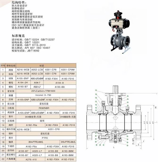 氣動固定式球閥,氣動固定式法蘭球閥:兩片式和三片式固定球閥又稱測裝分體式球閥,將閥體沿與閥門通道軸線相垂直的截面分為不對稱的左右兩半,它在管道上主要用于切斷、分配和改變介質(zhì)流動方向。它的樞軸結(jié)構(gòu)準(zhǔn)確的球體位置。標(biāo)準(zhǔn)閥座采用彈簧結(jié)構(gòu),將閥蓋推向球體,好的低壓密封性能。該球閥閥前、閥后閥座都能密封, 即所謂雙向密封特性,利用自帶的排放閥,閥體中腔可向外排放。樞軸采用防爆出保護(hù)結(jié)構(gòu),低摩擦系數(shù)的軸承等?煽啃愿,用途廣泛,價格合理等。