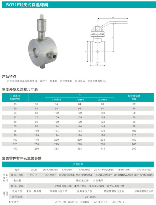 對夾式保溫球閥,BQ71F保溫球閥主要型號:手動(BQ71F)氣動(BQ671F)電動(BQ971F)BQ71F對夾式保溫球閥主要應(yīng)用于化工、石油、制藥、冶金等行業(yè)的系統(tǒng)管路中,主要作用是輸送在常溫狀態(tài)下會凝固、易結(jié)晶的介質(zhì)。具有結(jié)構(gòu)緊湊、體積小、重量輕、密封性能好、啟閉靈活、安裝方便等特點。