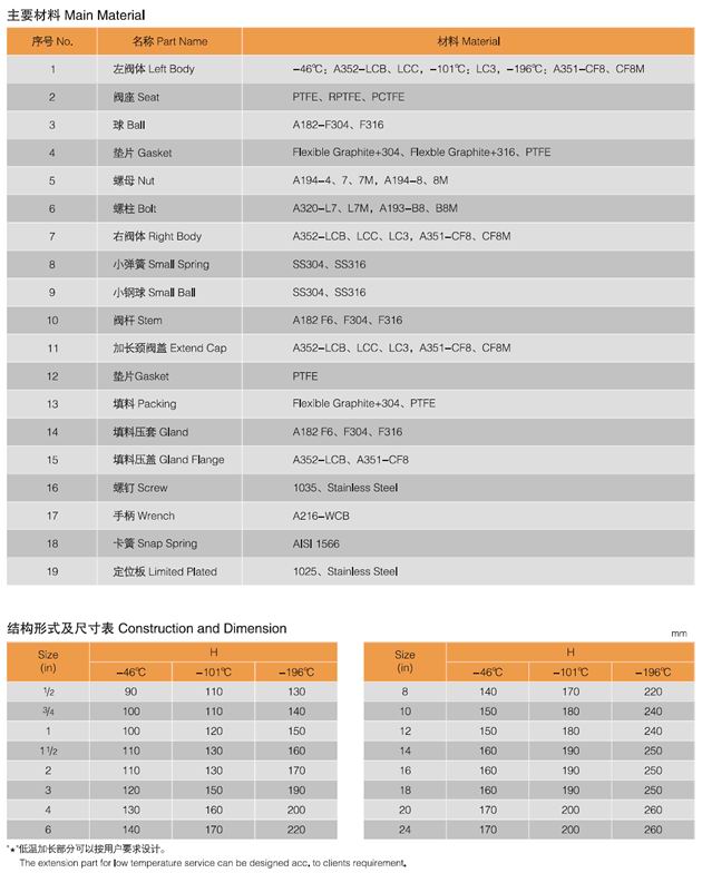 液化天然氣閥門的材料非常重要,材質(zhì)不合格,會造成殼體及密封面的外漏或內(nèi)漏;零部件的綜合機械性能、強度和鋼度滿足不了使用要求甚至斷裂。導(dǎo)致液化天然 氣介質(zhì)泄漏引起爆炸。液化天然氣閥門的過程中,材質(zhì)是首要關(guān)鍵的問題。閥體、閥蓋采用:LCB(-46℃)、 LC3(-101℃)、CF8(304)(-196℃).