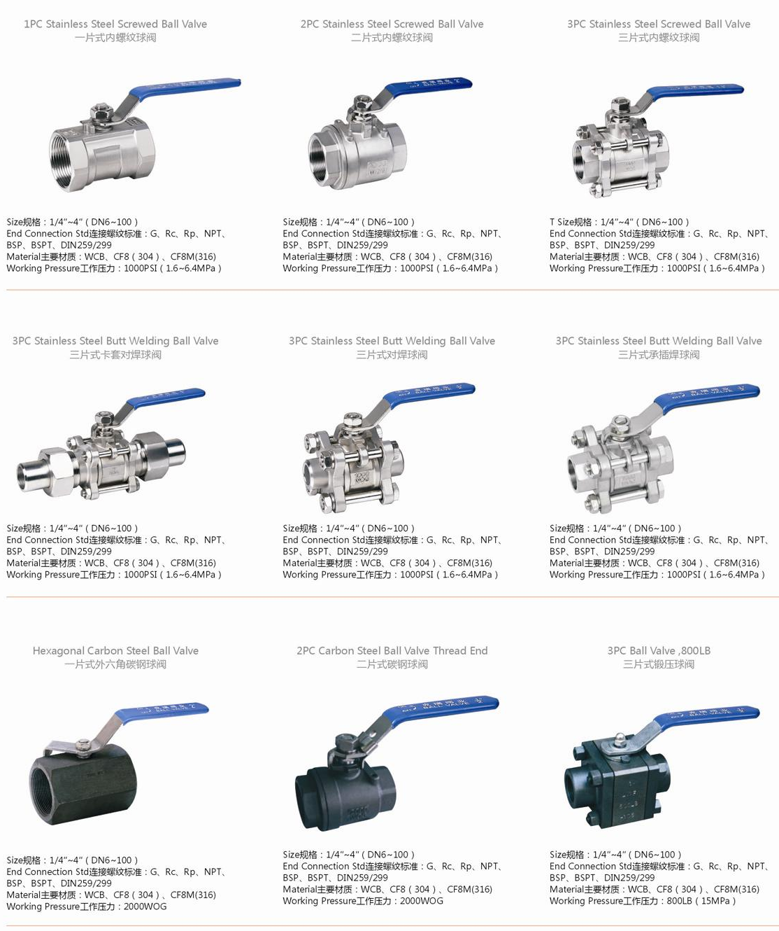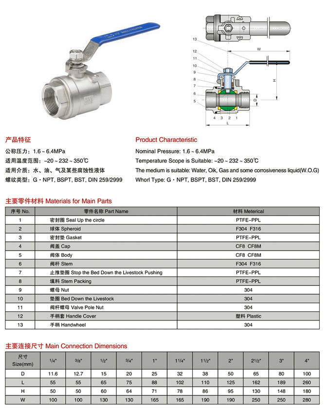 絲扣球閥,不銹鋼絲扣球閥公稱壓力:1.6-6.4MPa 適用溫度范圍:-20~232℃~350℃ 適用介質(zhì):水、油、氣及某此腐蝕性液體W.O.G 螺紋類型:G·NPT.BSPT.BSP.DIN259/2999