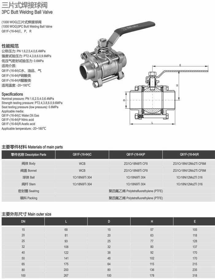 三片式焊接球閥產(chǎn)品特點(diǎn):應(yīng)用規(guī)范公稱(chēng)壓力:1.6-16MPa 適用溫度:-20~150℃~350℃ 焊接類(lèi)型:對(duì)焊(BW)、承插焊(SW)三片式焊接球閥。